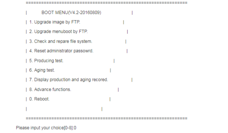 #重启设备后立即按住“ctrl+B”进入Menuboot界面,选择数字4重置管理员密码。