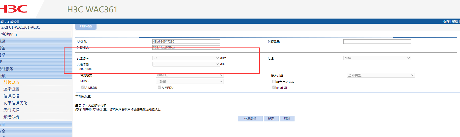 在界面左侧的导航栏中选择“射频 > 射频设置”,进入如图所示射频设置页面。