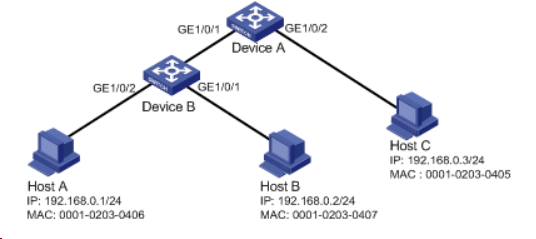 Host A与Host B分别与Device B的端口GigabitEthernet1/0/2、GigabitEthernet1/0/1相连;Host C与Device A的端口GigabitEthernet1/0/2相连。Device B接到Device A的端口GigabitEthernet1/0/1上。各主机均使用静态配置的IP地址。