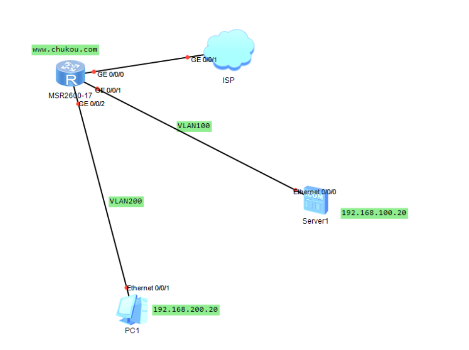 [Router-Vlan-interface200]nat server protocol tcp global current-interface 80 inside 192.168.100.20 80 ------这个配置没用
