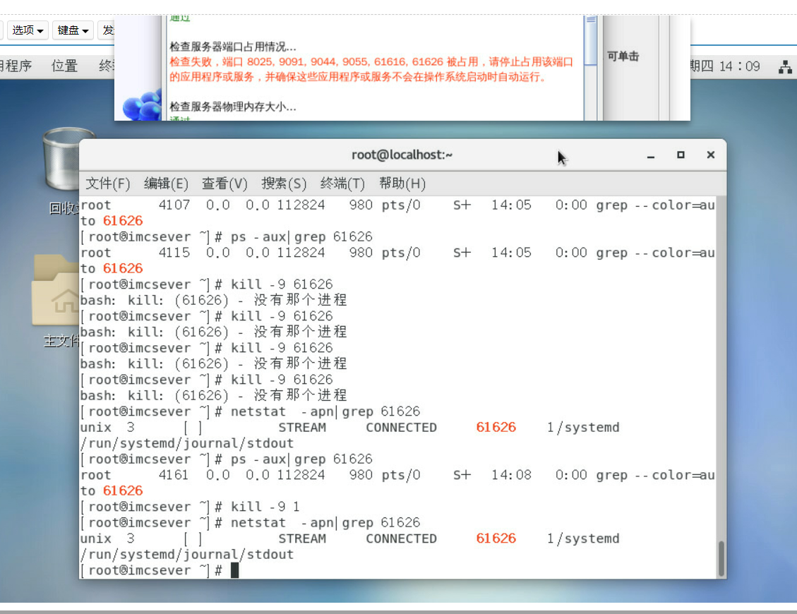 部署环境是官网的H3linux-iso那个,部署完之后安装imc提示说有服务器端口被占用,如图所示,于是我就去百度查看如果关闭这些端口的进程,查看了8025,9091,9044,9055,61616这几个端口都没有看到有相关的进程,查看61626端口时看到有进程,查看的进程是1(大概是,我也不确定)。然后想杀掉1这个进程,执行命令之后,再看61626这个端口的利用,还是能看到,如下图所示,想问一下这是什么情况,没弄过linux,求大佬解惑,感谢感谢。