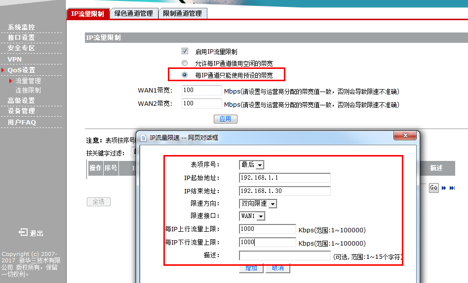 可以限速,出口30M,如果可以平均分配一下,以下举个例子,比如192.168.1.1-30,30个IP地址,每个IP地址限制为1M: