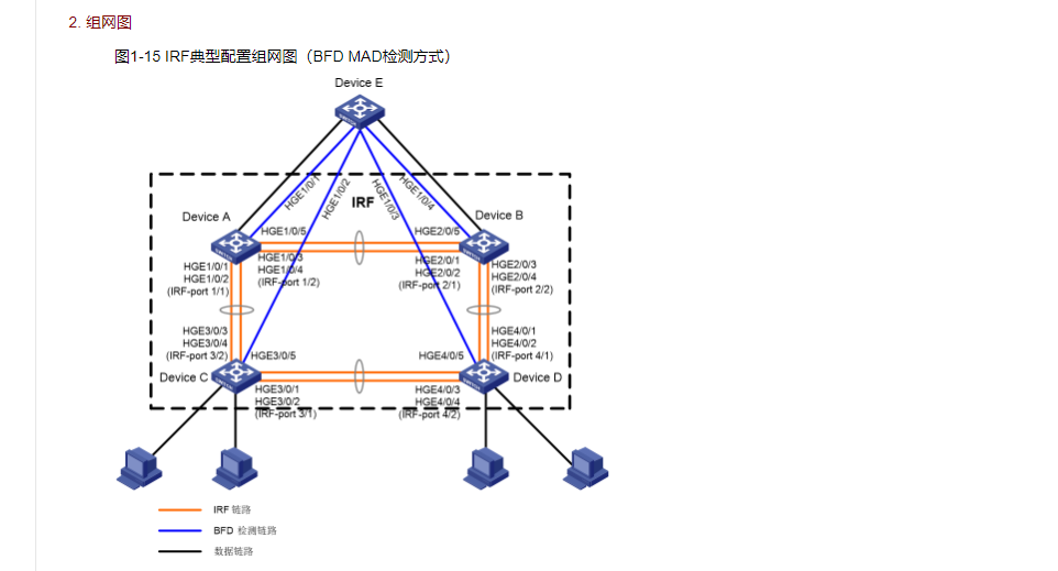·     鉴于IRF技术具有管理简便、网络扩展能力强、可靠性高等优点,所以本例使用IRF技术构建网络汇聚层(即在四台设备上配置IRF功能),每台成员设备与上层设备Device E之间均有一条上行链路连接。