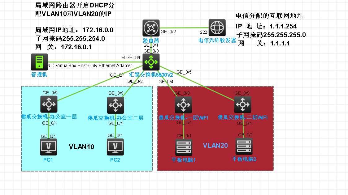 1、vlan 10和VLAN 20的网关放在S5500交换机上,交换机配置DHCP