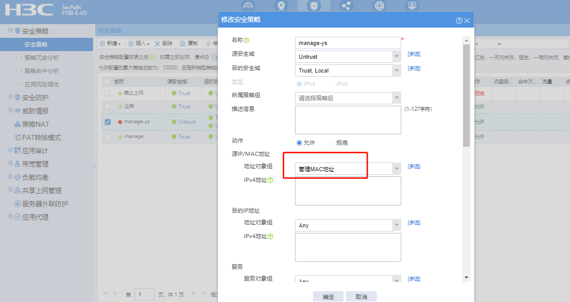 防火墙放通了Untrust-Trust, Local策略,想设置只有指定的MAC地址能访问,设置后变成所有MAC地址都无法访问了,MAC地址肯定没输错。