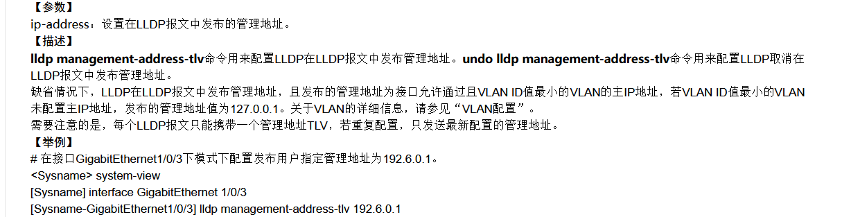 这样在其他设备dis lldp neighbor-information verbose时就会显示ip地址了。不支持该命令的设备多数也会在对端将这个参数修改后主动将自己的management-address-tlv修改成ip地址。
