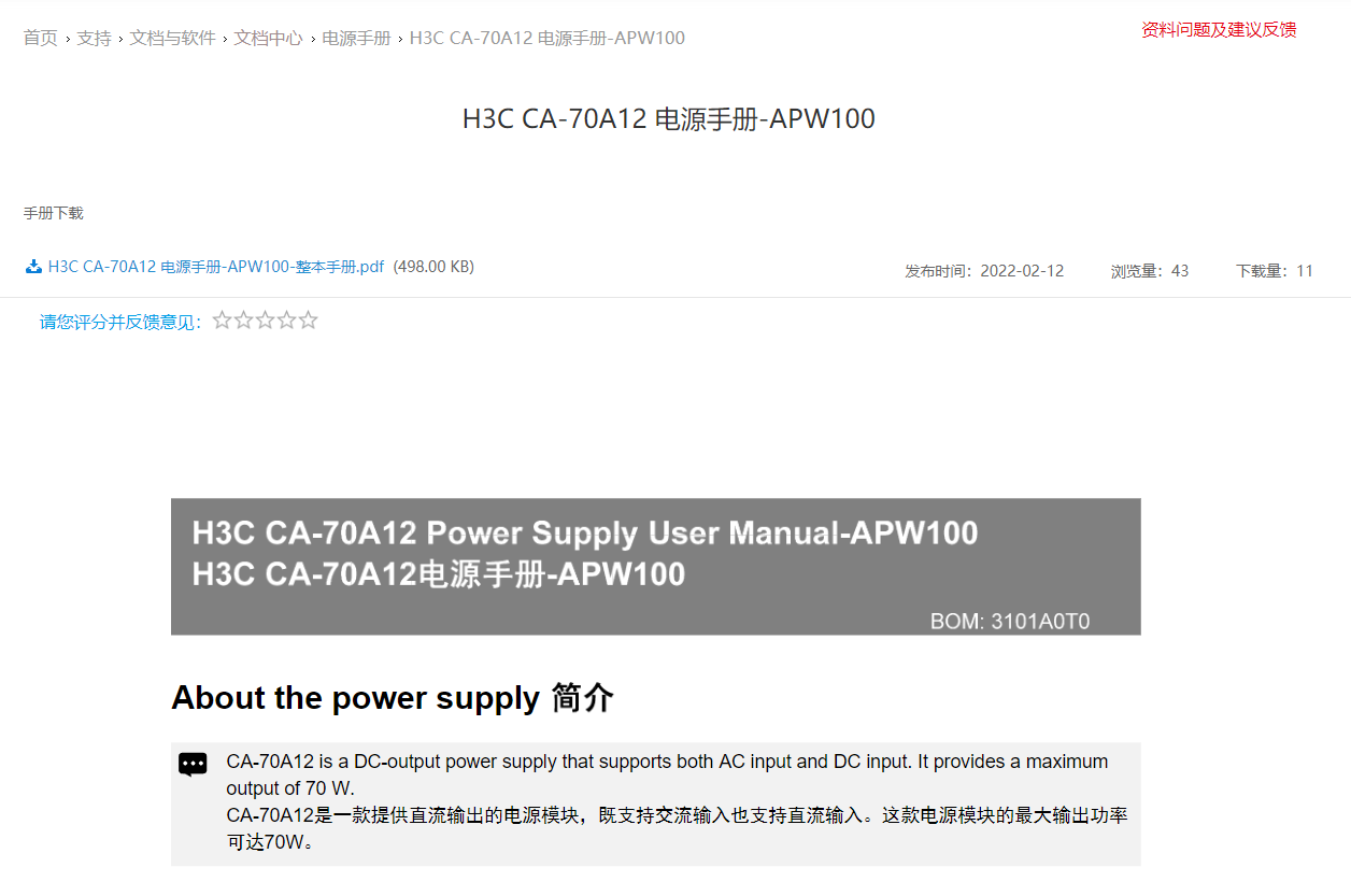 https://www.h3c.com/cn/Service/Document_Software/Document_Center/Home/Public/00-Public/Installation/Power_Supply_Manual/H3C_CA_70A12-1939/?CHID=651304