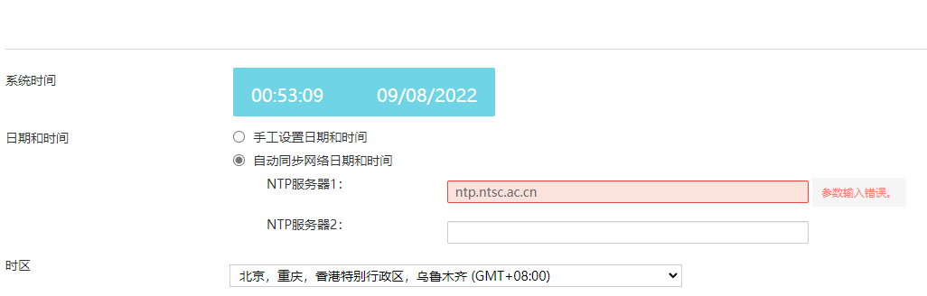 如下图所示,设备时间不对,想用NTP自动同步,但是输入域名提示参数输入错误,难道必须要要用IP地址才可以吗?公网NTP服务器IP地址有些可能是错误的,相对来说用域名靠谱一些。