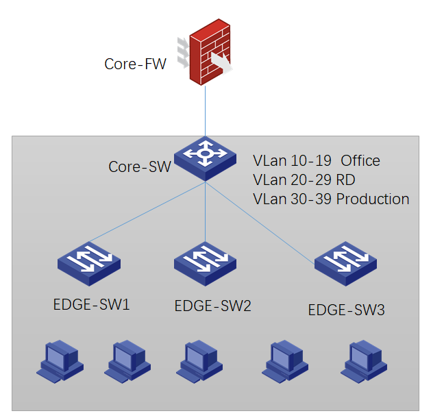 我会在CORE-SW配置好所有的二级部门VLAN,但这样就会产生很多直连路由,我想让二级部门的这些子网形成一个RD区域连接到Firewall接口上,让Firewall来控制一级部门之间的访问策略。
