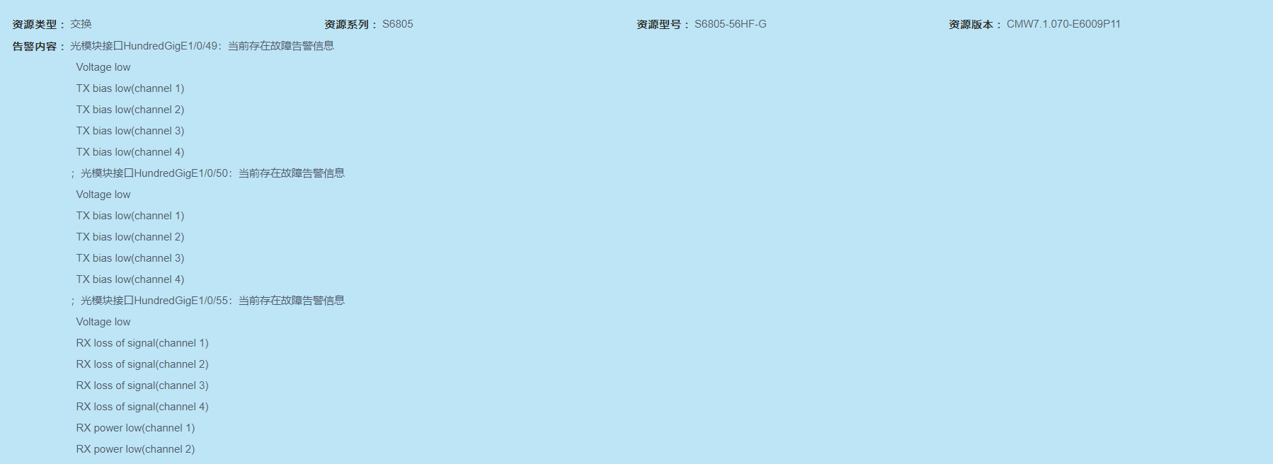 巡检时发现有光模块 Voltage low TX bias low(channel 1)的告警信息,但是端口是up的,收发光也正常,请问怎么解决?