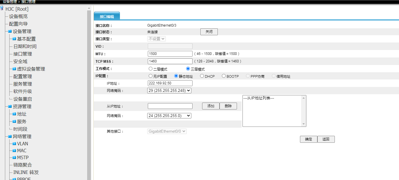 [H3C-security-zone-Untrust]import interface GigabitEthernet 1/0/3