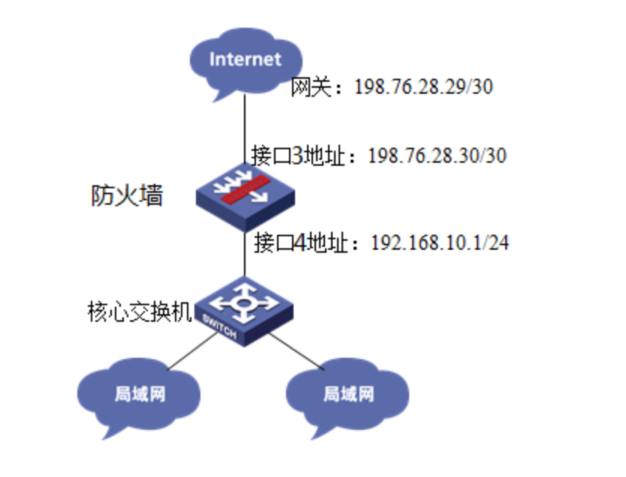将防火墙部署在互联网出口,使用固定IP地址线路接入互联网。运营商提供的IP地址为198.76.28.30/30,网关为198.76.28.29,DNS地址为114.114.114.114。初步规划防火墙使用3接口接入运营商,使用4接口连接内部网络,内部网络使用192.168.10.0网段,要求内网终端可以自动获取到地址并可以访问互联网。
