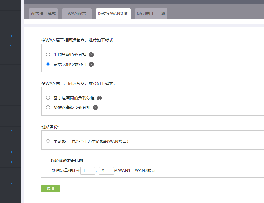 一条宽带,带宽10M。一条宽带带宽100M。选择好多WAN属于相同运营商,推荐如下模式:下的带宽比例负载分担。分配链路带宽比例