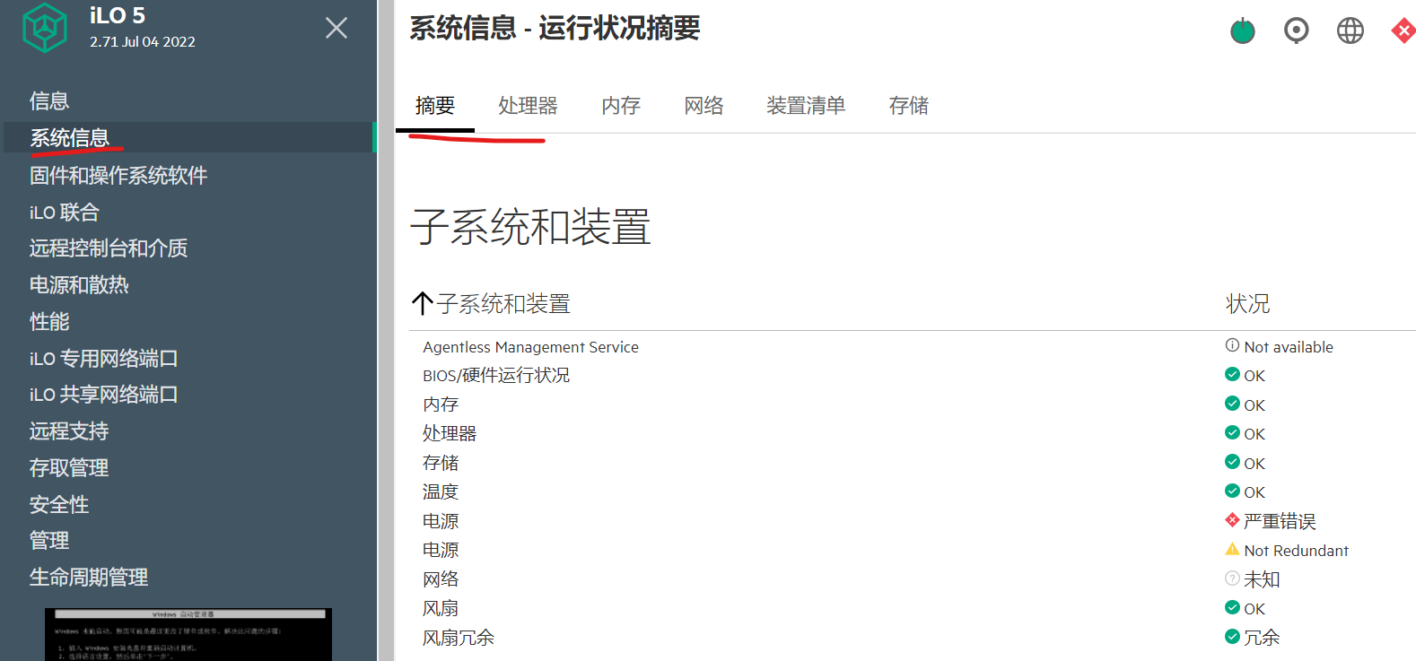 登陆到ilo上。先看系统信息 摘要中是否有硬件报警