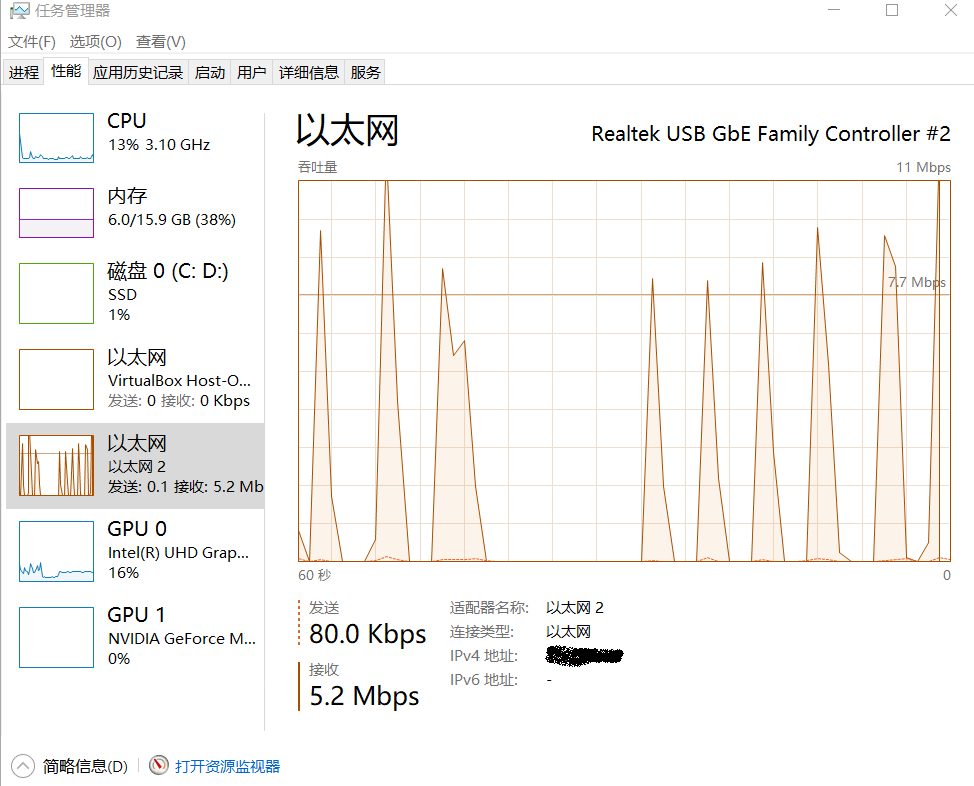 笔记本电脑,配置不错,10710+16GB+1TB固态,chrome播放西瓜视频1080p,用的typec扩展坞转接的有线网卡,接口1000Mbps,视频有规律卡顿,卡顿时间很短,流畅几秒钟然后零点几秒钟的卡顿,看任务管理器网卡速度有规律变化,如果视频暂停,则网卡吞吐量也停止,如图中的波谷。