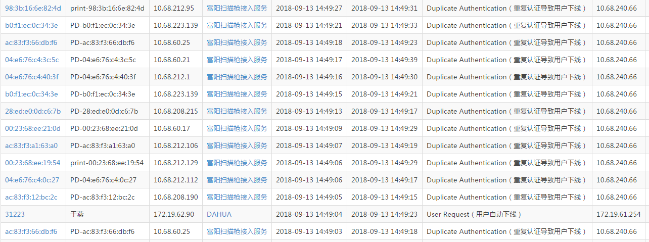 客户现场对无线扫描枪进行哑终端的MAC认证,在接入日志中出现大量Duplicate Authentication下线原因日志,如下图,请问这种日志是否正常,由于什么原因导致?是否是无线终端漫游导致?