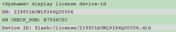 在命令行界面的任意视图下执行display license device-id命令,显示信息中SN字段的值即为该参数的取值。