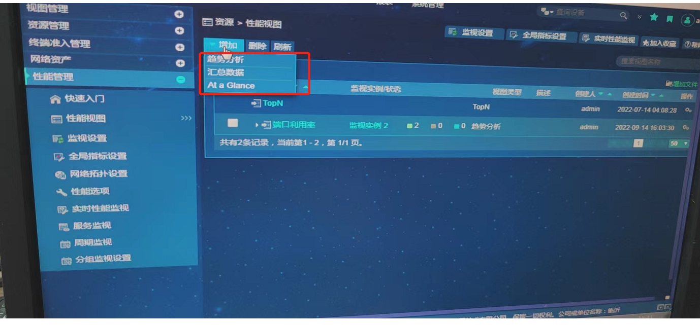 At a Glance类型性能视图仅提供了设备在CPU监视、内存监视、设备缺陷、IP报文统计、接口统计指标组下性能监视数据的展示,不能切换到汇总数据以及趋势分析类型的视图,并且在创建过程中不能选择监视指标,只能选择监视实例。