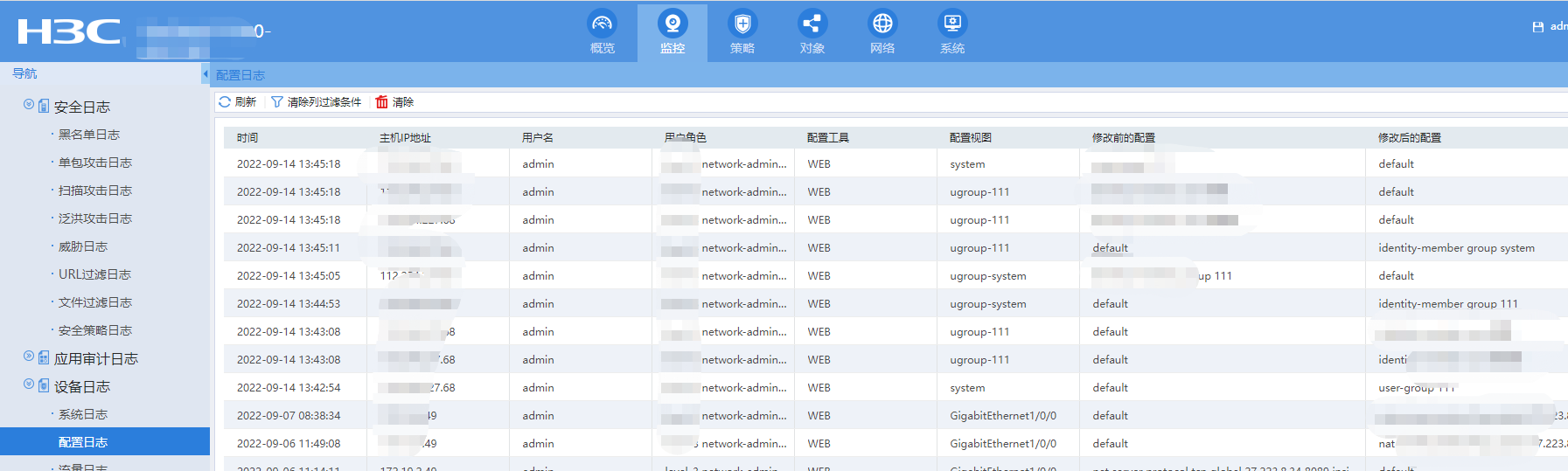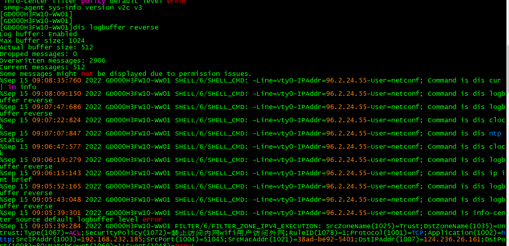 在防火墙上配置了info-center,配置如下。在web界面新增VLAN,新增安全策略都没有相关操作记录输出到logbuffer,在命令行进行的相关操作命令可以在logbuffer输出。