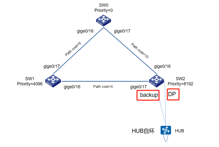 SW0、SW1、SW2都开启了RSTP,连HUB的端口状态分别为Backup和DP,这时候HUB下面出现自环了,SW2环路检测机制是把下联HUB的两个接口都关闭吗?