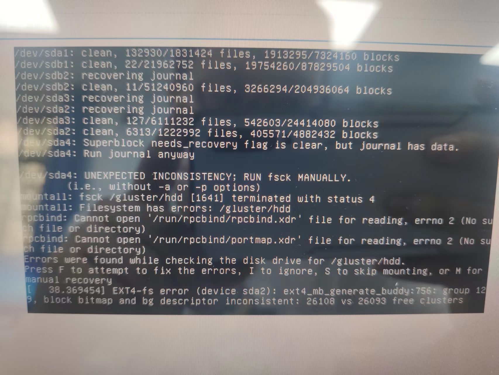 登录系统以后,使用fsck -p /gluster/hdd和fsck -y /gluster/hdd修复,该按Y的按Y,修复以后重启系统,发现还有别的目录无法挂载,使用同样的办法全部修复。