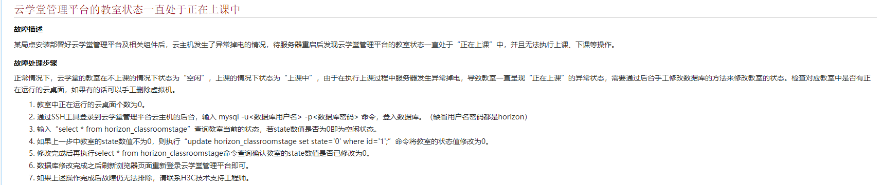 修复文件系统以后,可以顺利登录教师端,但是一上课却提示已经上课,去web后台查看,发现教室显示上课中,实际却没有虚拟机启动,通过搜素知了社区,找到了如下解决办法: