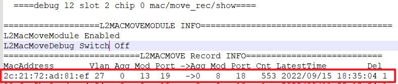 诊断信息中『debug l2 slot 2 chip 1 mac/move_rec/show』可以看到如下MAC地址漂移记录: