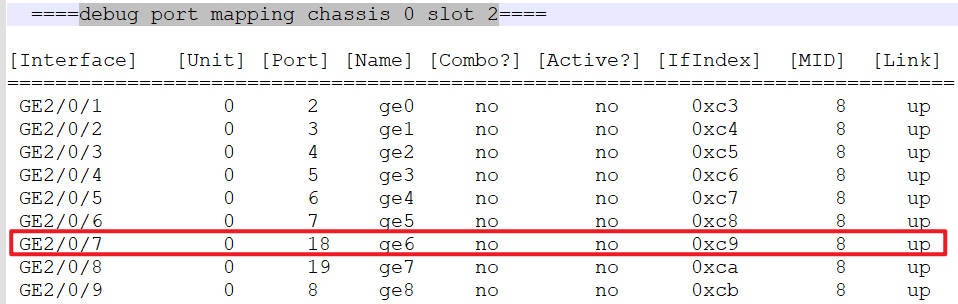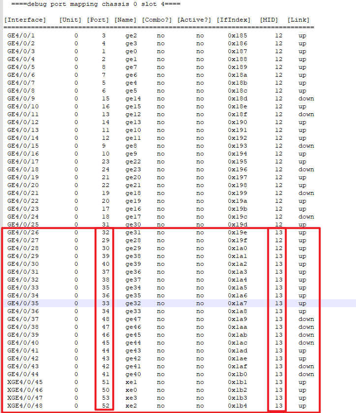 『debug mac/move_rec/show』漂移记录中slot2的4个芯片显示结果一样,『debug port mapping 』查看到的所有槽位中只有slot4有mid=13,如图上列出的。