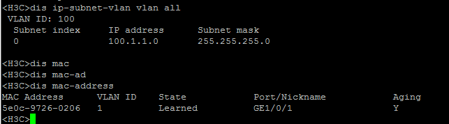以上为配置文件和查看的信息,这里怀疑的问题点是,mac地址学习到了VLAN 1上,理论上应该要学习到VLAN 100上才能通