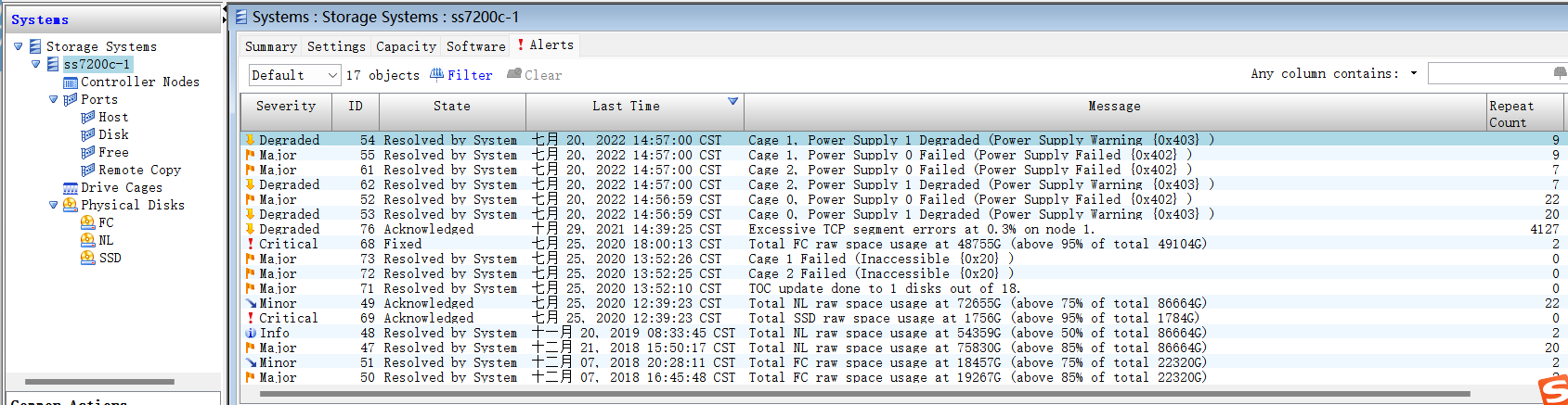 之前的告警更换完电源了吗,如果更换完电源执行admithw。如果还是告警建议收集日志,空间不足也会告警。