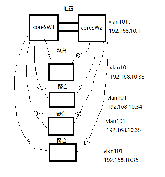 大致拓扑如下组网描述里画的,两台核心堆叠,下面接入层交换机都是两根线绑定聚合