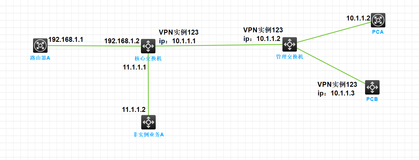 1、这个路由器A访问PCA和PCB,非实例路由和实例互通,路由应该怎么写?