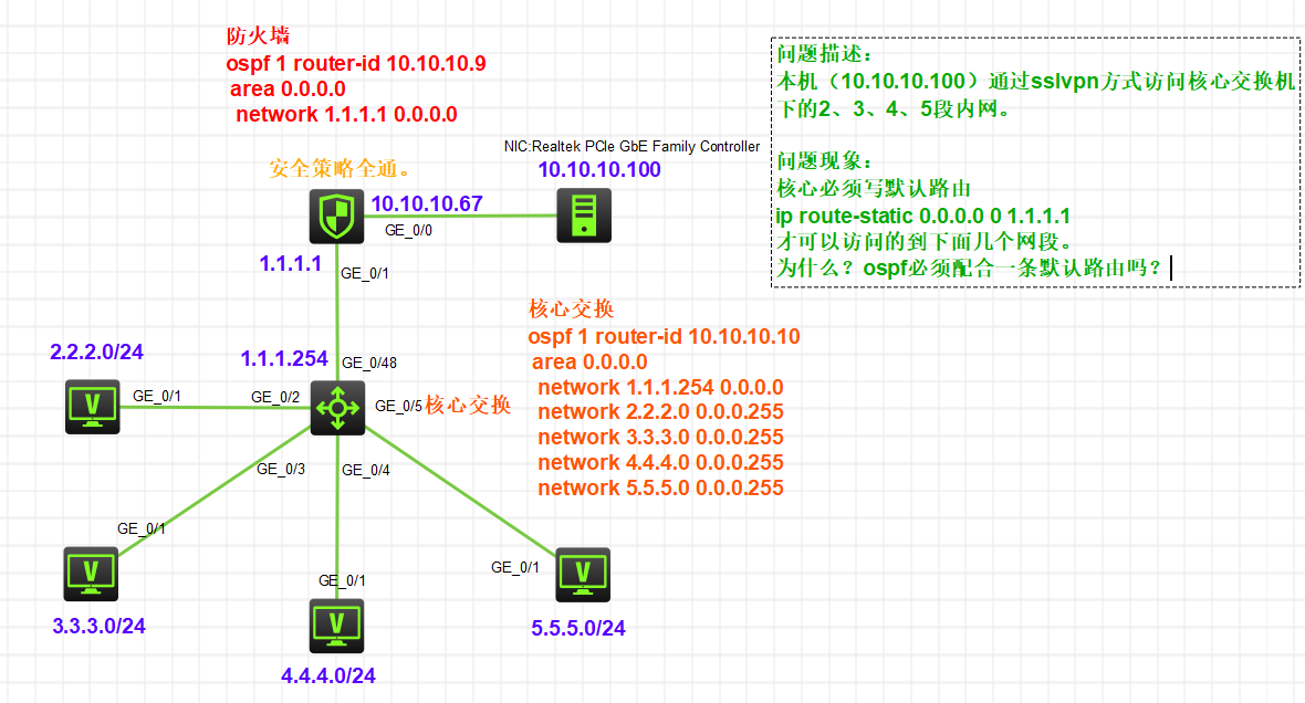核心不写默认路由到FW,FW也是可以ping通核心下的几个内网段,按理说路由应该没问题了才对,但是如果是通过sslvpn拨到FW上,则核心需要写默认路由之后才能通。不明白。