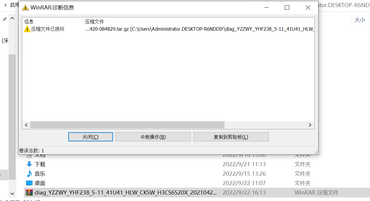 PC使用inode ssh登录到公司内网,连接到内网的一台交换机,想使用FTP将交换机的一个文件下载到PC上,但是下载下来的安装包解压时提示文件已损坏是什么原因,麻烦各位大神帮忙看一下