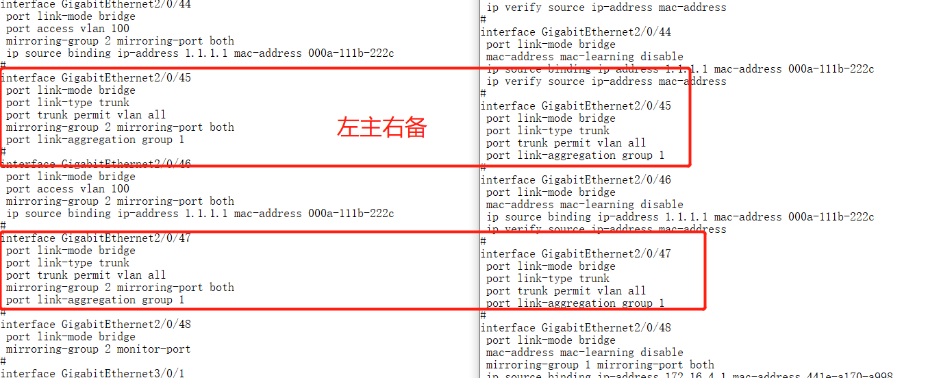 看了聚合口配置,发现主机配置了镜像口,备机未有配置,是否这个原因导致单向不通,聚合为静态聚合