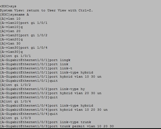 看配置全网都是同一网段,只是通过vlan划分进行了tag之间的隔离。能否ping通首先要确认arp是否能学习到? 如果arp学习不到,肯定ping不通,看当前的配置,连接终端的接口都是h口,并且没有修改PVID,这样进入端口的流量会打上PVID转发。