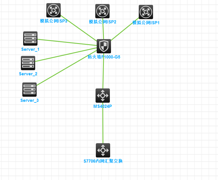 一台H3CF1000-S-G5防火墙,一台H3C MS4024P-EI交换机,四台服务器,4条外网专线,现有内网为华为S7706汇聚交换机。要求:1.内网能访问四台服务器;2.外网能通过WEB或指定地址访问服务器。