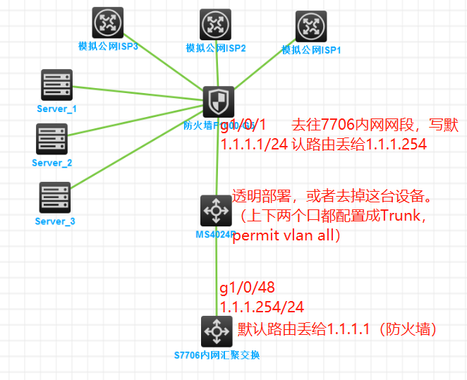 防火墙内接核心交换机,服务器接到核心上,防火墙外接专线做NAT,根据业务情况写静态,同时映射内部防火墙的业务。
