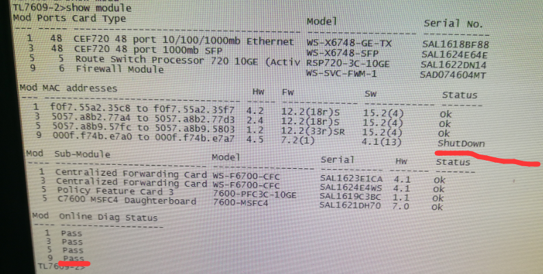cisco 产品,show module 看到9号板卡的状态显示是shutdown 。但是online status 是pass状态。请大神解释一下。是说明这块板卡硬件损坏了吗?还是其他原因?
