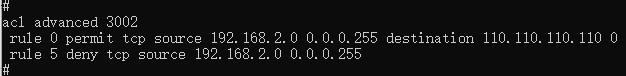 机房通过一个5130交换机连接到核心通外网,现在要求所有电脑只能访问一个外网网站,通过ping得知此网站外网IP为110.110.110.110,没做策略前一切正常,之后在交换机48口上联端口做了一个策略如图: