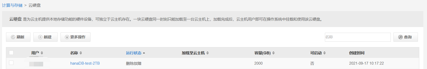 如图,云硬盘正常状态下,点击销毁,一段时间后提示“删除故障”,进而无法再继续销毁和回收。