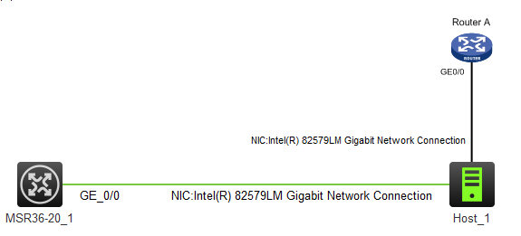 右键单击设备MSR36-20_1,在弹出菜单中点击“连线”选项,鼠标进入连线模式。单击设备MSR36-20_1,在弹出的接口选择菜单中选择GE0/0作为连线源接口,然后点击设备Host_1,在弹出的接口选择菜单中选择宿主机的物理网卡(此处为Inter(R) 82579LM Gigabit Network Connection)作为连线目的接口,连线完成后,鼠标右击退出连线状态。添加连线详细介绍请参见“6.3 连线操作”。