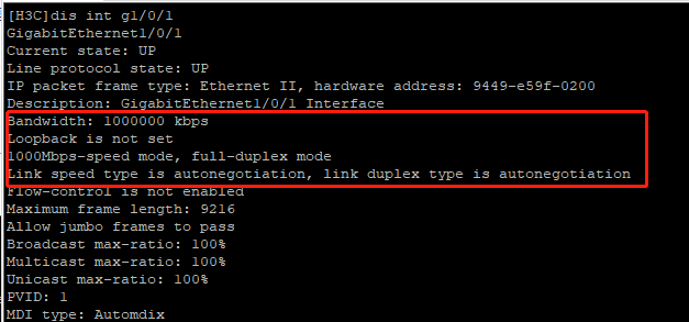 可以使用dis interface gi 端口号 类似的命令查看端口协商的模式。