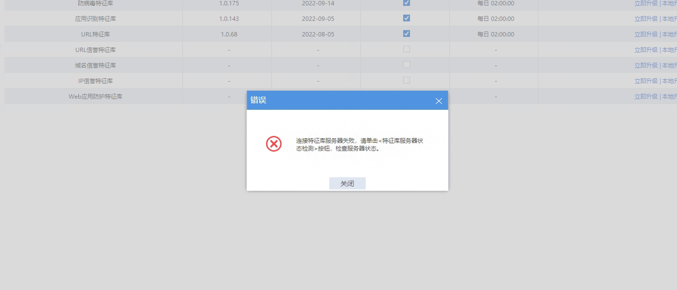 防火墙是出口设备点击在线升级就弹出检查特征库服务器连接失败,dns配置了,怎么也ping不通,请问是怎么回事