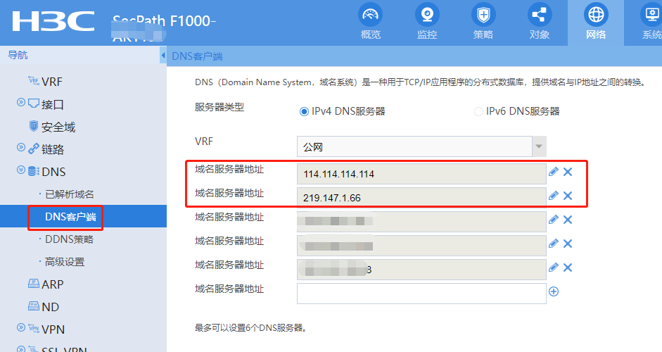 2、防火墙上配置dns server 114.114.114.114指向到DNS服务器。