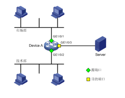 Device A通过端口GigabitEthernet1/0/1和GigabitEthernet1/0/2分别连接市场部和技术部,并通过端口GigabitEthernet1/0/3连接Server。通过配置源端口方式的本地端口镜像,使Server可以监控所有进、出市场部和技术部的报文。
