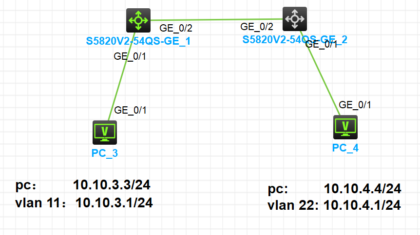 两台不同网段PC,分属不同网段VLAN,分别接入两台二层交换机,现在这个两台PC需要通信,如何配置