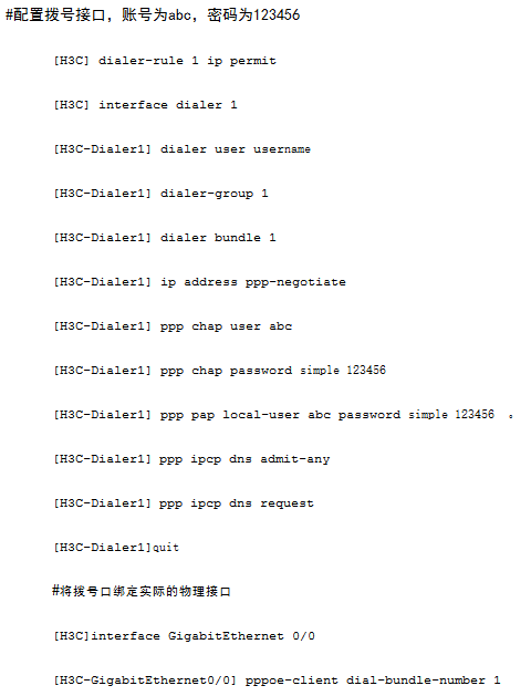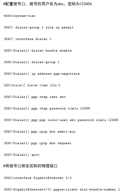 拨号失败先检查配置问题,按照正常配置问题行不通的话,那就是运营商问题,找运营商即可,下面是华三提供的配置: