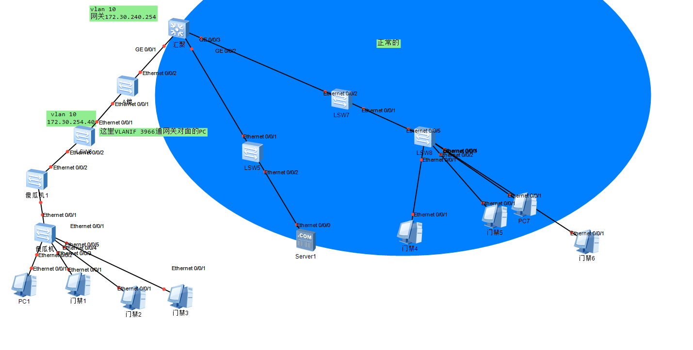 PC1ping网关提示目标主机不可达,我在接入交换机起的VLANIF是可以通网关和门禁4 5的。希望得到帮助感谢,