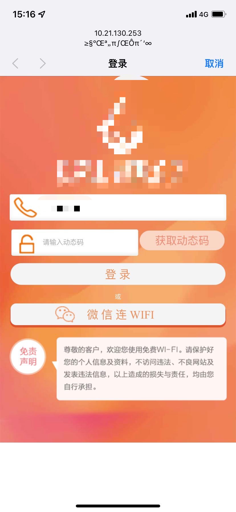 连接wifi时能够弹出认证界面,输入手机号后点获取验证码没有反应,随便输入了一个验证码提示设备拒绝访问。